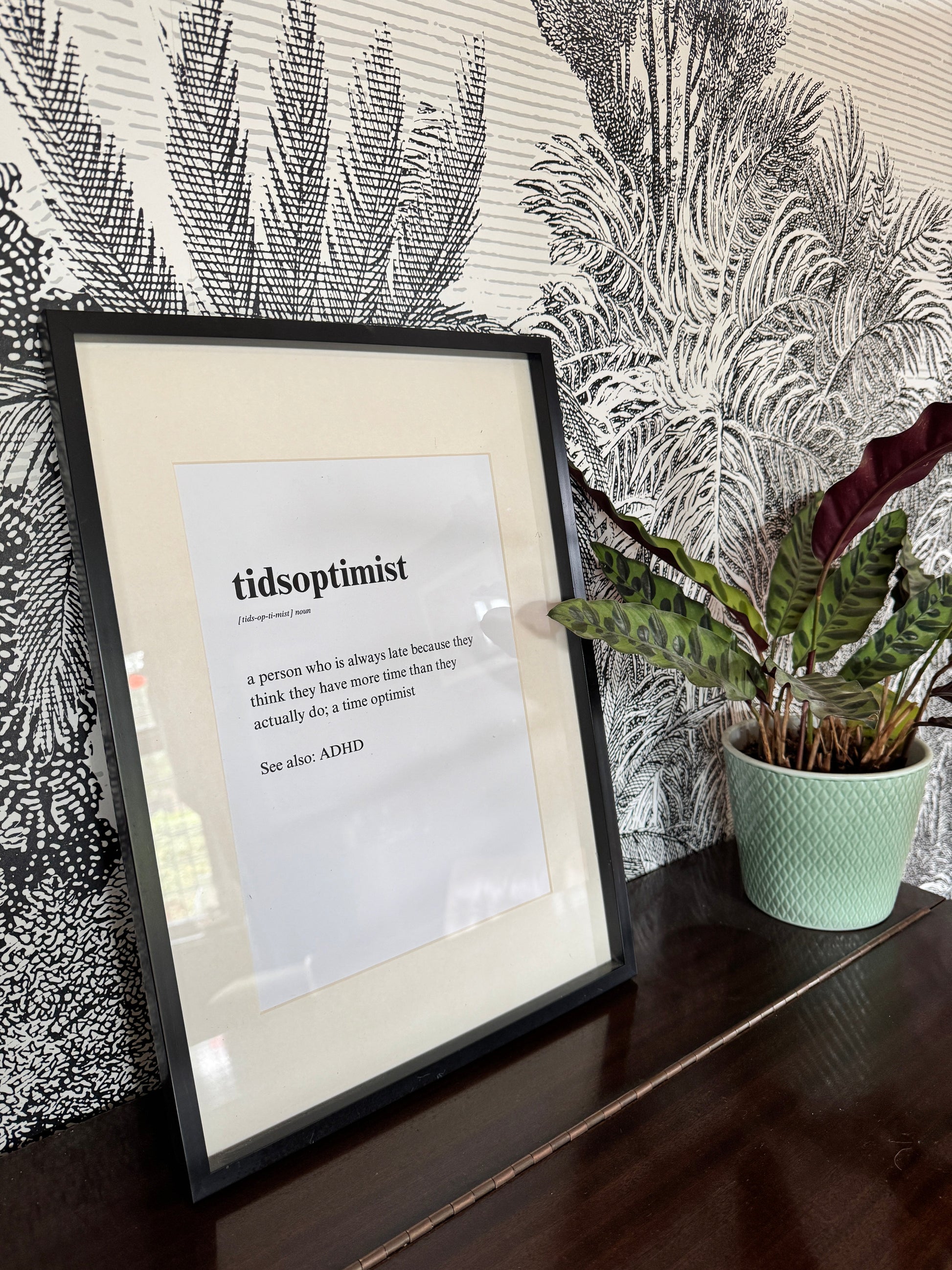 Are you pathologically late for everything? This tidsoptimist print is for you.